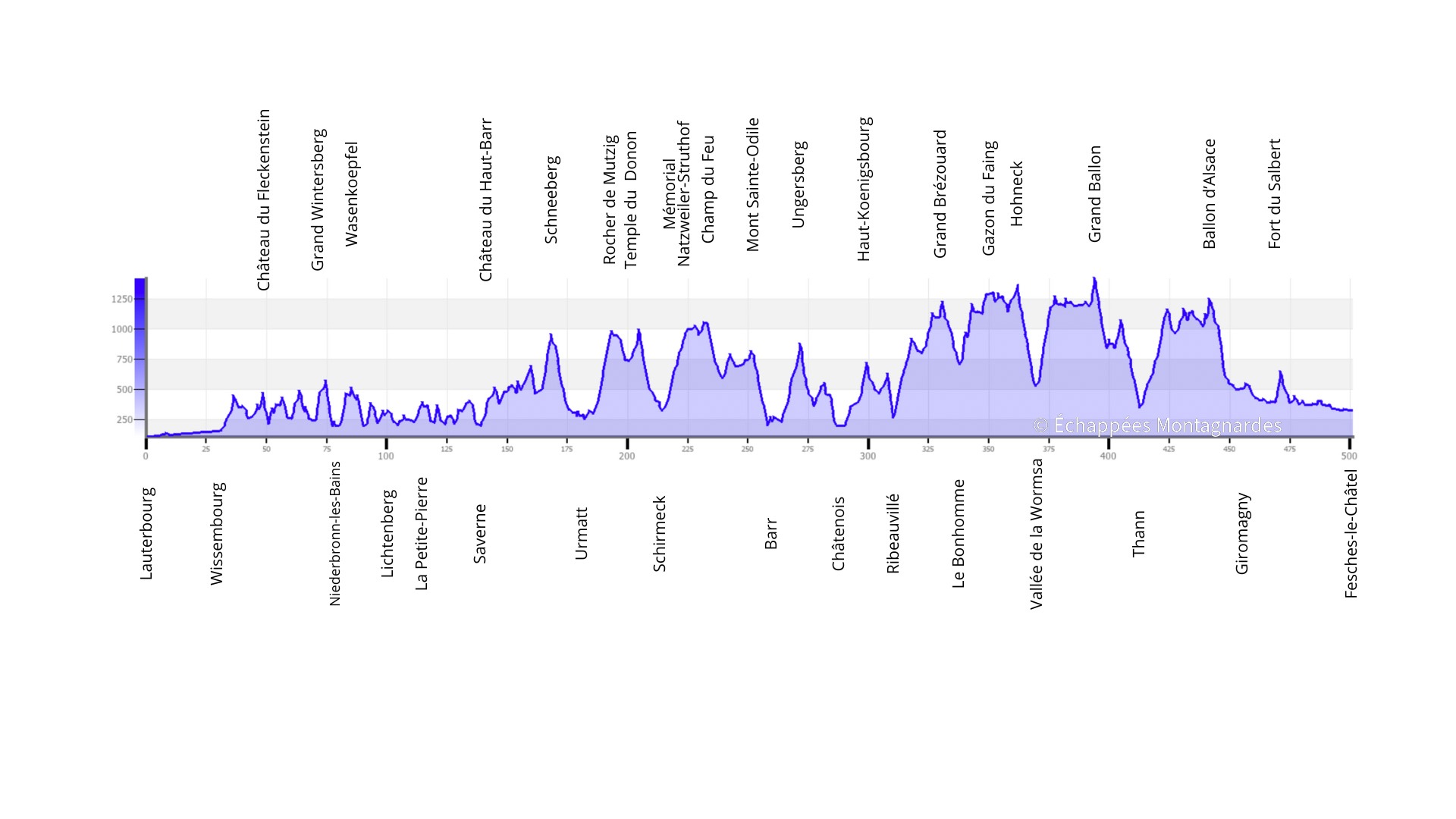 Trois sections bien distinctes apparaissent sur ce profil : la première partie, dans les Vosges du Nord et jusqu’à Saverne, est une succession de petits reliefs, parfois surplombés de magnifiques châteaux. La deuxième, dans les Vosges moyennes, se compose de montées et de descentes plus longues, entre des vallées toujours assez basses et des sommets plus élevés, comme le Donon ou le Champ du Feu… Enfin, les 190 derniers kilomètres de la traversée, à travers le parc naturel régional des Ballons des Vosges, constitue la portion la plus exigeante physiquement, avec l’enchainement rapide de sommets de renom tels que le Grand Brézouard, le Hohneck, le Grand Ballon et le Ballon d’Alsace.